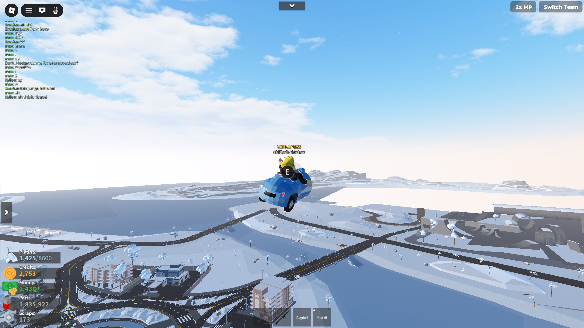 While driving mopetti mini, getting out while pressing w, sends you and the car up until the skybox. I think there’s a certain peace which collidies with avatar, if broken it doesn’t fly anymore. Works with any avatar. Even in derby. Happens everytime.