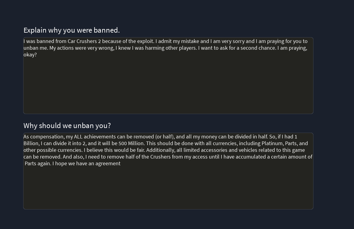 Well, about 5 months ago, i got banned in CC2 and the reason was Exploiting. And yes that is true, and i m so sorry and i m begging for unban in cc2 . I already told that information in discord server. But they won’t accept my sorrys. I dont know what to do. Please help me. i just need second chance.