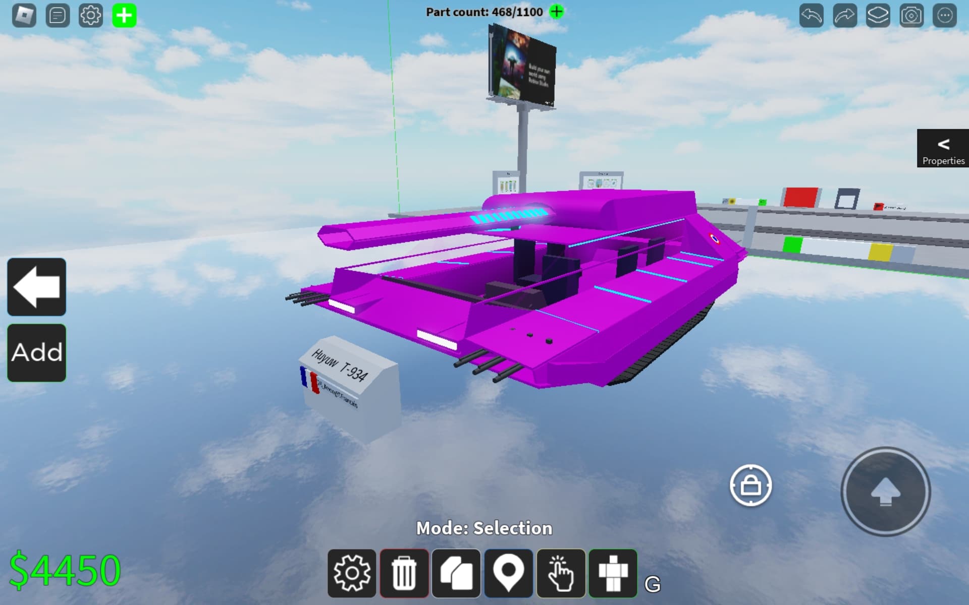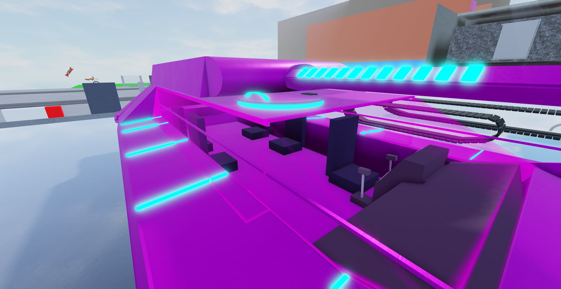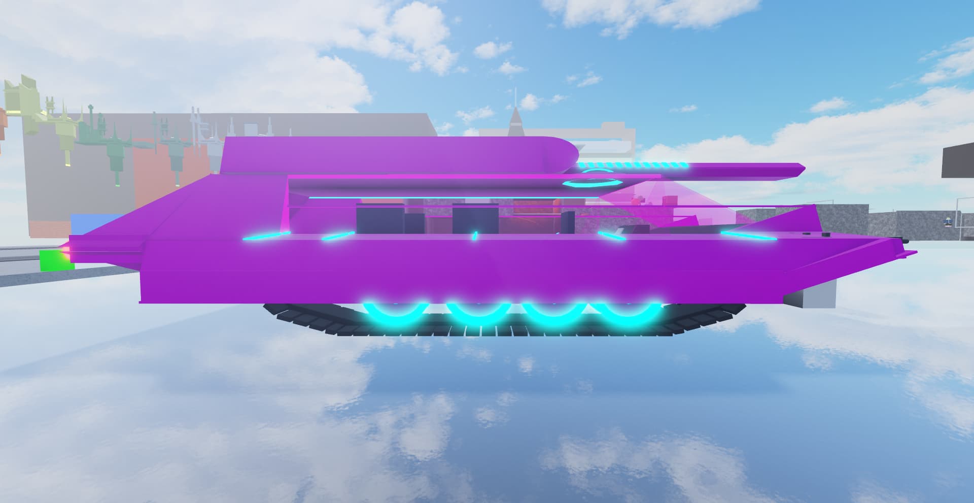 The Huyuw T-934 is a synthwave retro-futuristic tank with a lazer cannon (similar to the Exoniphy Mk1 but flat like a plate) and it also has 6 machines guns on the fenders (3 for each side)