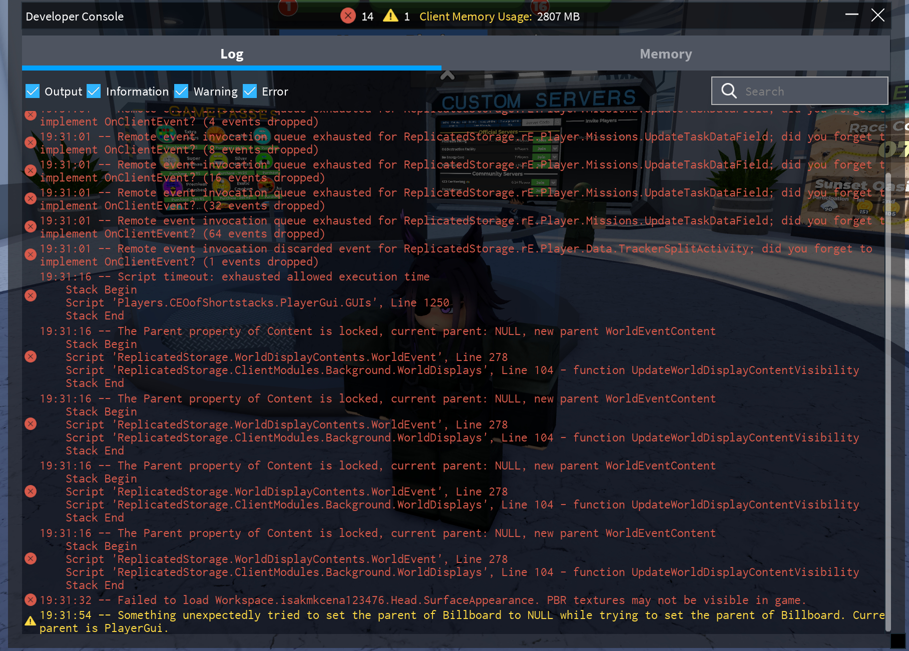 If yes, screenshot all red and yellow text in the developer console and post it here.(Open console by pressing F9 on computer, or by saying /Console in the chat)