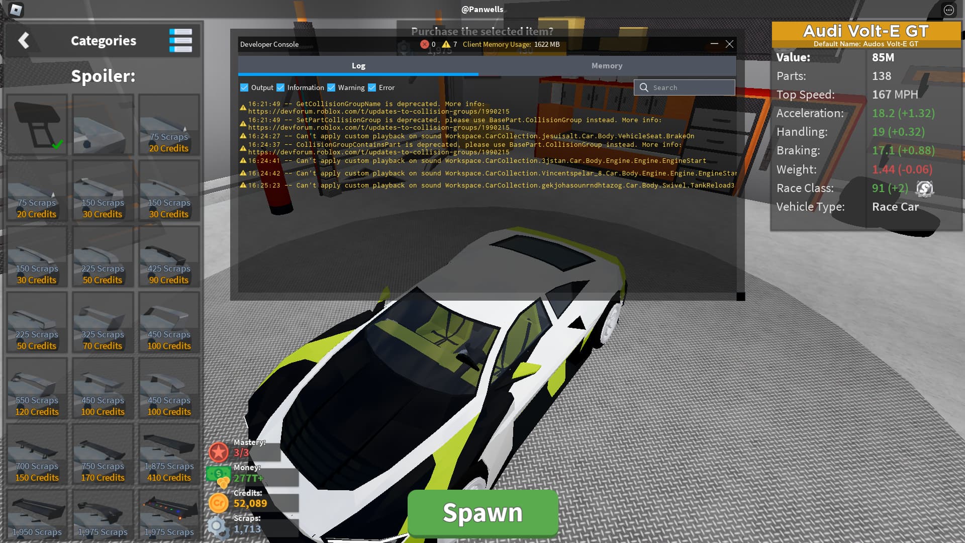 - On 3 out of 4, the part that mounts them to the rear of the car doesn’t load in, and the curved 1975 part spoiler doesn’t appear at all.
