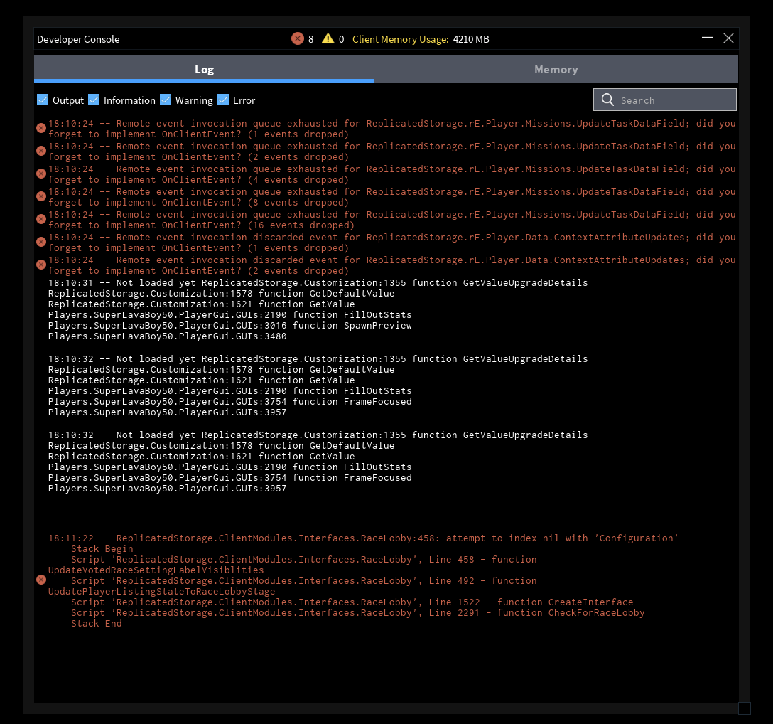 If yes, screenshot all red and yellow text in the developer console and post it here. (Open console by pressing F9 on computer, or by saying /Console in the chat)