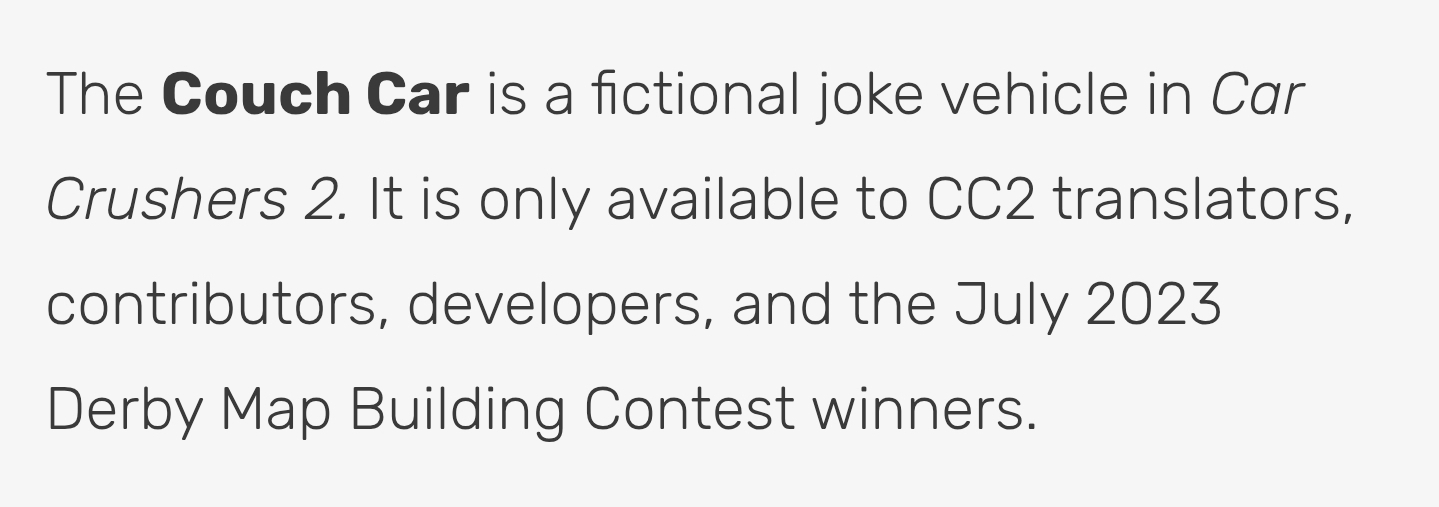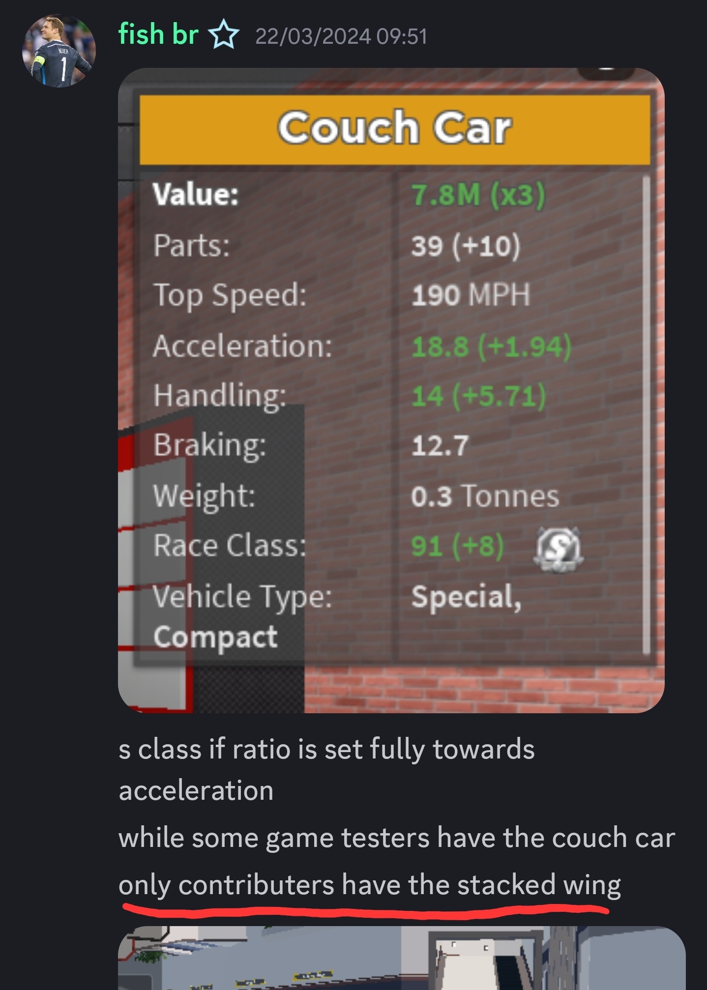 Plus I found a message from fish br on the discord where he says that some testers could have the couch car, but that they can’t have the spoiler you see in the picture so I rather think he won a giveaway (or maybe a has already gotten the contrib role because once you leave it you still own the items it gives)