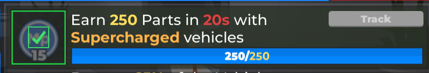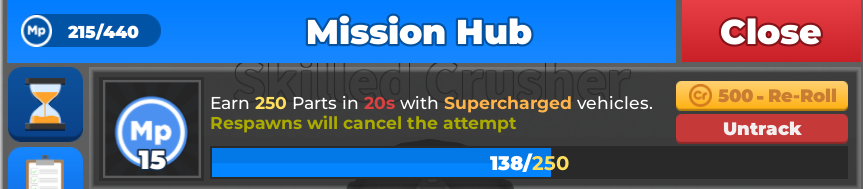 didn’t see this anywhere else, also not sure if fits here but it seems to be the best spot, this mission is honestly super stupid and nearly cost me my streak, the main reason it sucks so much is that you aren’t guaranteed a supercharged vehicle that is worth 250 parts, i had to spend hours and go through dozens of vehicles and in the end had to spend credits to get a expensive plow upgrade for a truck to complete this, if your unlucky it may take hours and hours to complete this and you may not even be able to as again, the supercharged vehicle isn’t guaranteed to be 250 parts, in my opinion it should have the no respawn requirement removed, this would allow any supercharged vehicle to complete this mission while still needing to move fast.