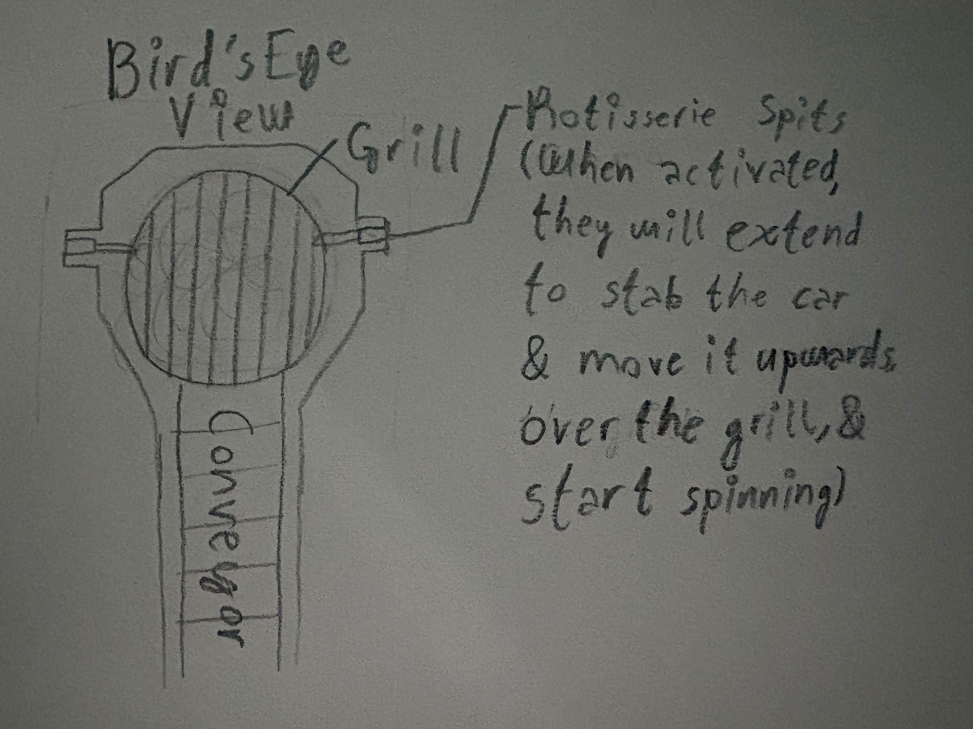 In this crusher, you’ll drive over a grill. When your car is settled, rotisserie spits will come out of the walls and stab your car, then slowly move upwards until stopping. Then, the spits will spin your car around, just over the grill. Then, the grill will emit fire. If your car is unaffected by the spits or falls off, the grill will still burn it to a crisp.